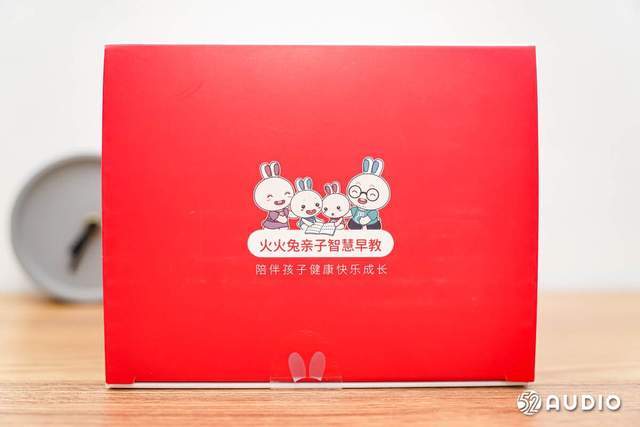 外包装顶部是同样的鲜红色,居中位置是卡通形象的兔子一家,印有标语“火火兔子智慧早教,陪伴孩子健康成长”。