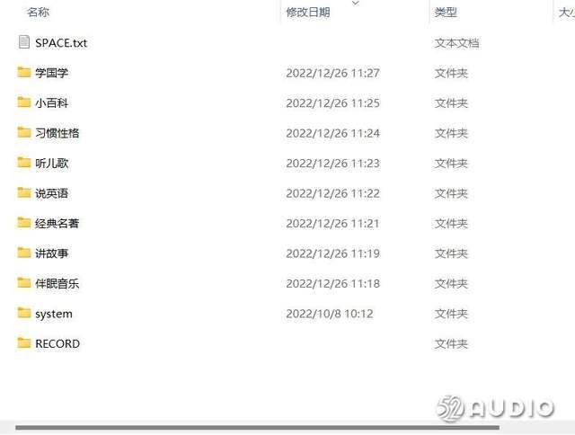 将数据线连接电脑后,产品会以U盘的形式呈现,打开优盘后可以看到已经分类好的资源文件夹,包括国学、小百科和习惯性格等,文件格式方面支持mp3和wav格式,需要注意的是新的音频需要放入已有的文件夹中,并不支持新建文件夹。